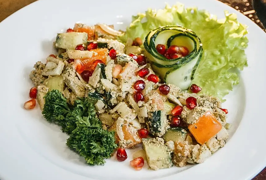 Обжаренные баклажаны с огурцами, болгарским перцем, луком, зеленью и грузинскими специями с уксусом
